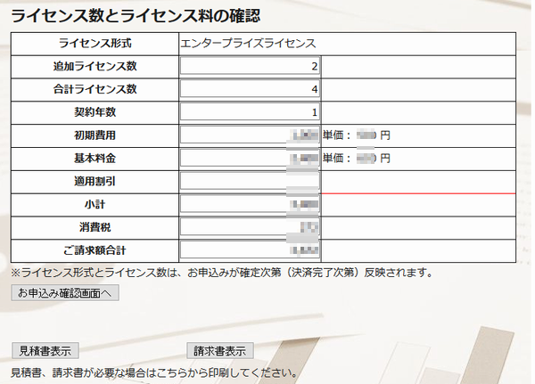 社内稟議などのために見積書や請求書が必要な場合には、「見積書表示」「請求書表示」ボタンを押して、表示されるページを印刷してご利用ください。