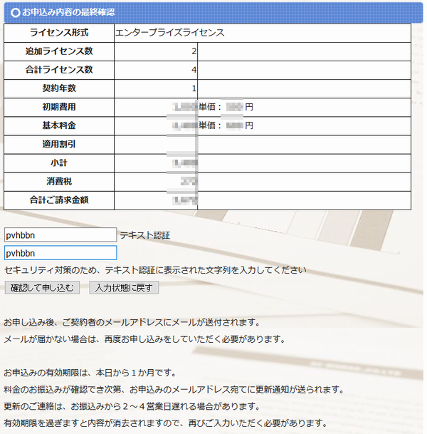 セキュリティ保護のため、テキスト認証で表示されたテキストをご入力の上「確認して申し込む」ボタンを押して下さい。