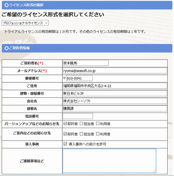 お申し込み画面で、ご希望のライセンス形式とお客様の情報を入力してください。