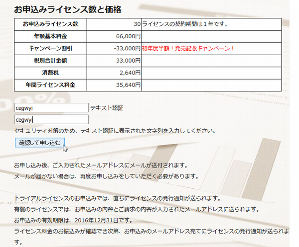 セキュリティ保護のため、テキスト認証で表示されたテキストをご入力の上「確認して申し込む」ボタンを押して下さい。