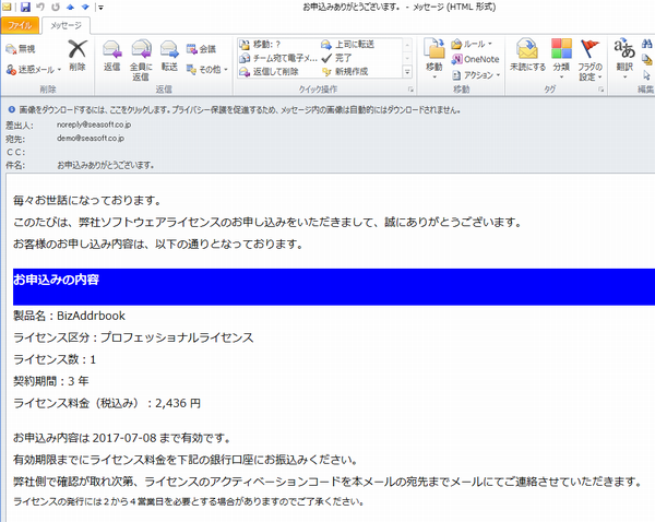 トライアルライセンスのお申込み時には、確認画面でのお申し込み後、直ちにアクティベーションコードがお申込みのメールアドレスに届けられます。