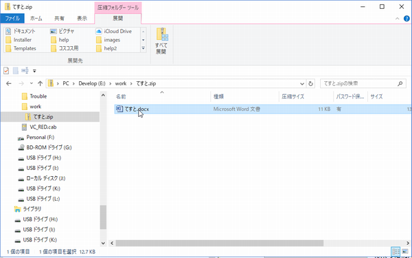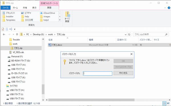 暗号化ZIP書庫が添付されたメールの場合、圧縮ファイルの内容をダブルクリックで開いたり、別のフォルダにコピーする際に、パスワードの入力を求められます。