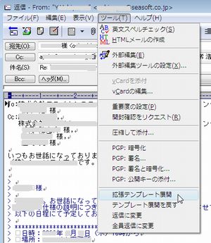 メール編集ウィンドウの「ツール」メニューには、「拡張テンプレート展開」、「テンプレート展開を戻す」、「返信に変更」、「全員返信に変更」メニューが追加されます。